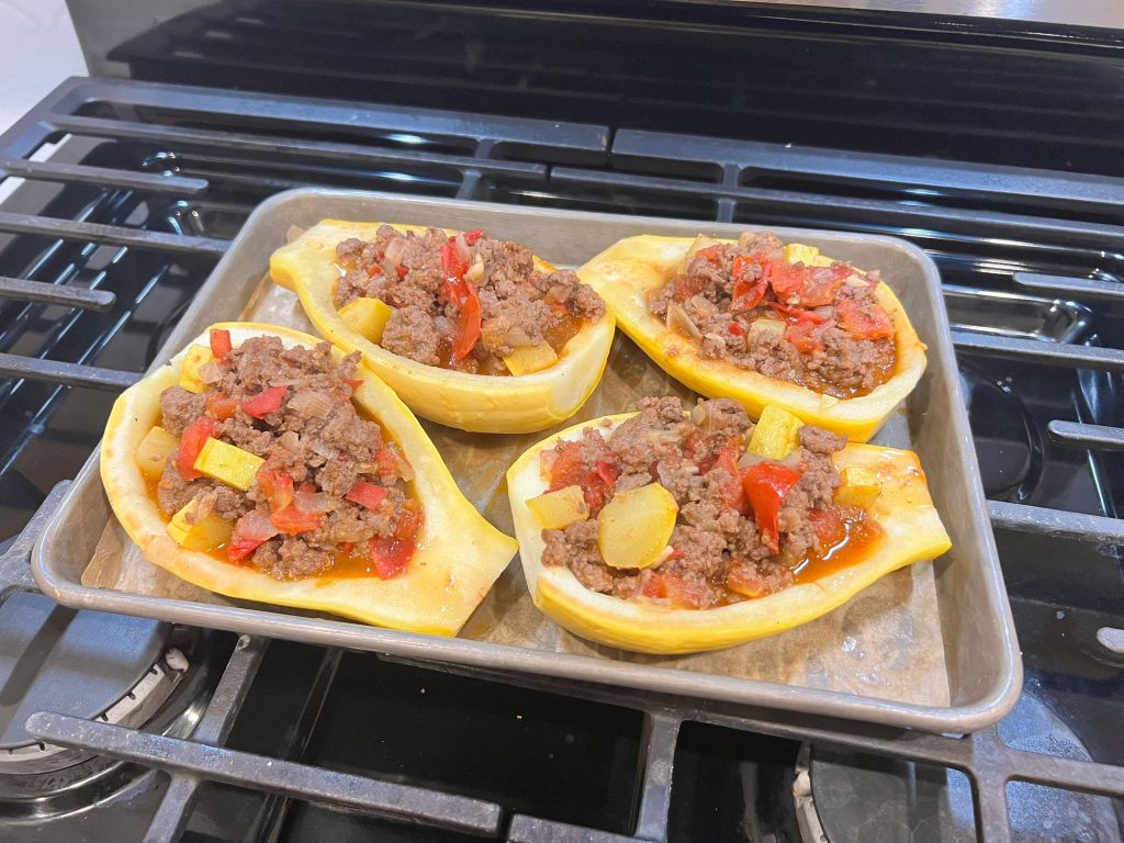 When creating this recipe, you will cut the squash in halves and cook it similar to a spaghetti squash. His idea of making a boat is genius. I will tell you though, when I made them, unfortunately I did not cook the boat long enough. I tasted them and they seemed fine, but it is better to cook them a little longer and make sure they are good, rather than missing the mark. One tip to know about large summer squash is that they are not always large. They start small and if forgotten about can become huge over one night. So, if you are growing them, be careful and make sure they do not get away from you.