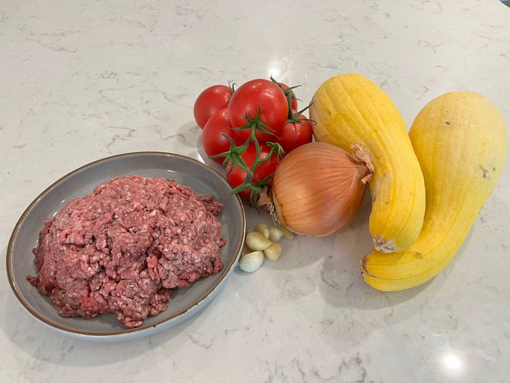 Step 2: Get a large saute pan and prepare the filling ingredients. Add the oil and saute the onions and garlic until translucent and soft. Add the spices, remaining yellow squash necks, and ground beef. When fully cooked, add the tomatoes. Once it is all cooked, set it aside for later.
