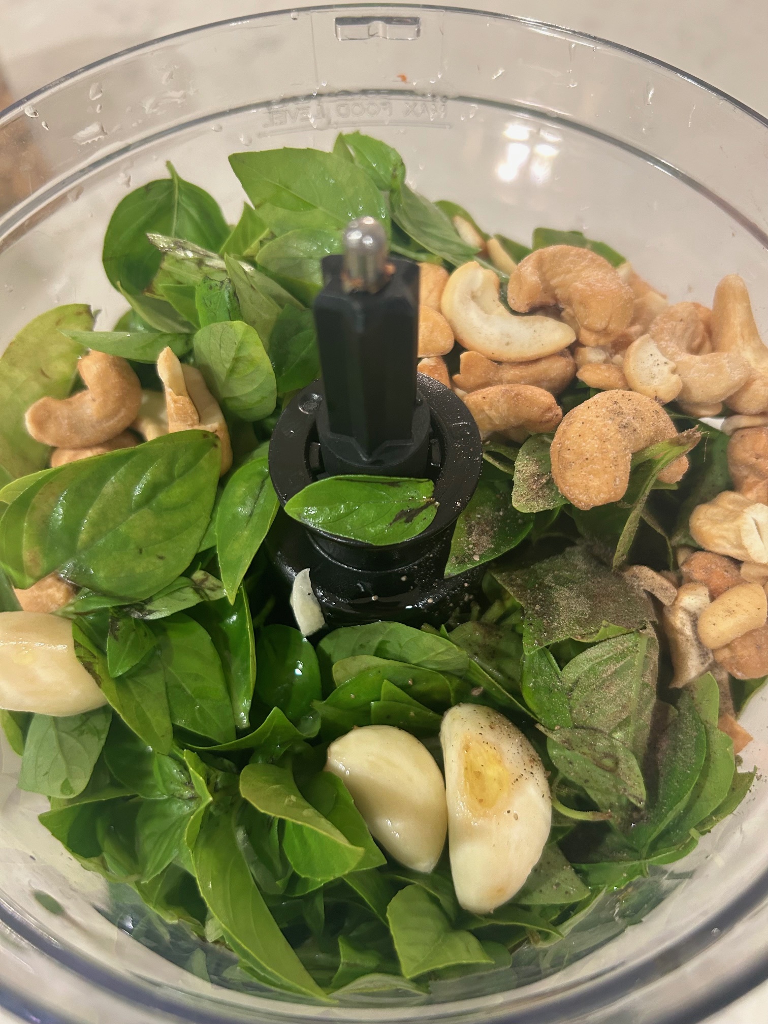 Step 3: Add all of the ingredients to the food processor and blend together until you get an almost puree consistency. You may need to scrape the sides of the container to make sure all of the basil leaves have been chopped sufficiently.